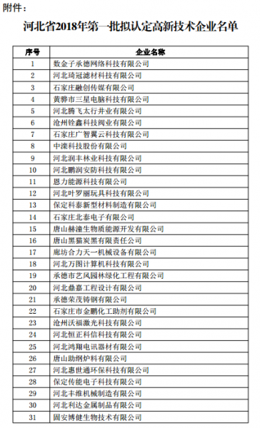 关于公示河北省2018年第一批拟认定高新技术企业名单的通知