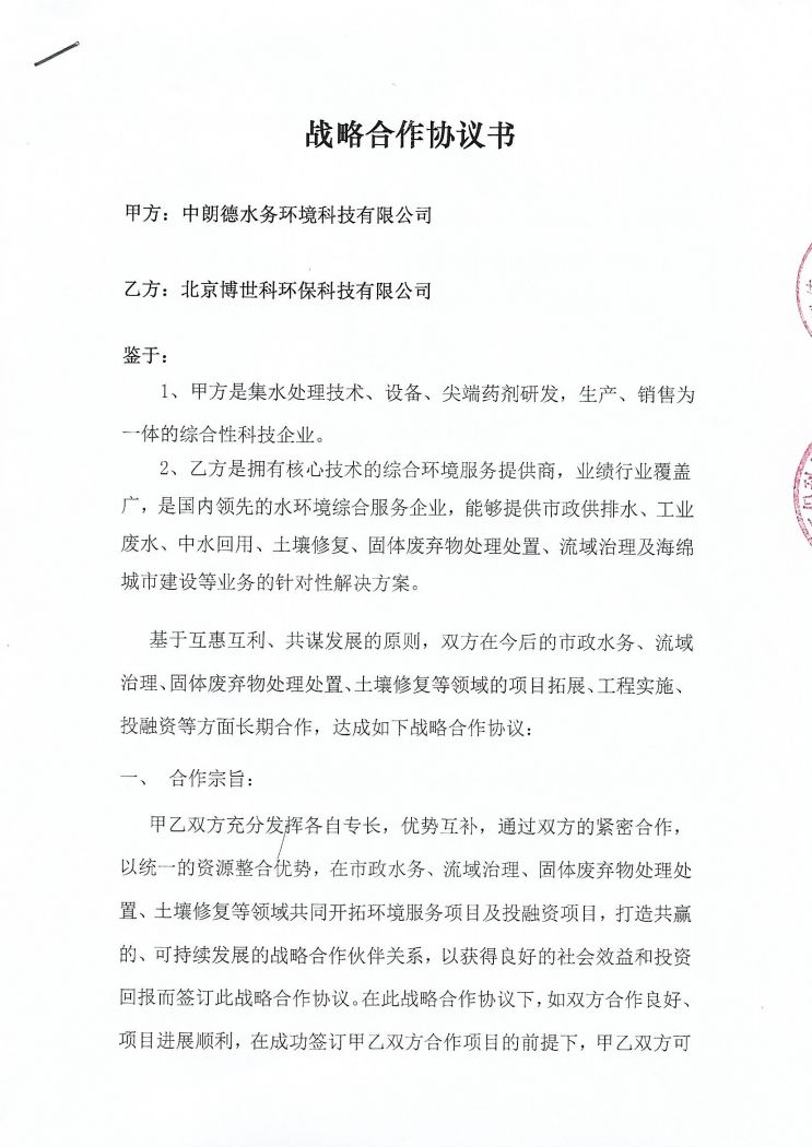 北京博世科环保科技有限公司与中朗德水务有限公司签署战略合作协议